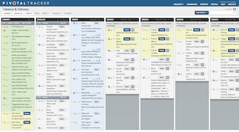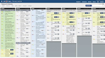 I like Pivotal Tracker. It’s a step-up from the cumbersome ticket tracking systems I’ve used in the past. As a manager though, it’s too cumbersome to see how my individual team members are doing and get an overall picture of how the team is doing at the same time. I’m only given a single backlog, which intermingles everyone’s tickets. I can see all tickets for a single engineer by using search, and I can pin each search results panel to get what I want. But if I reload the page, I lose all my efforts to build a usable dashboard. This is what I’m aiming for but without the hassle: a view of our current sprint (column one), our backlog (column two), our icebox (column three), and each engineer’s backlog (the remaining columns).
